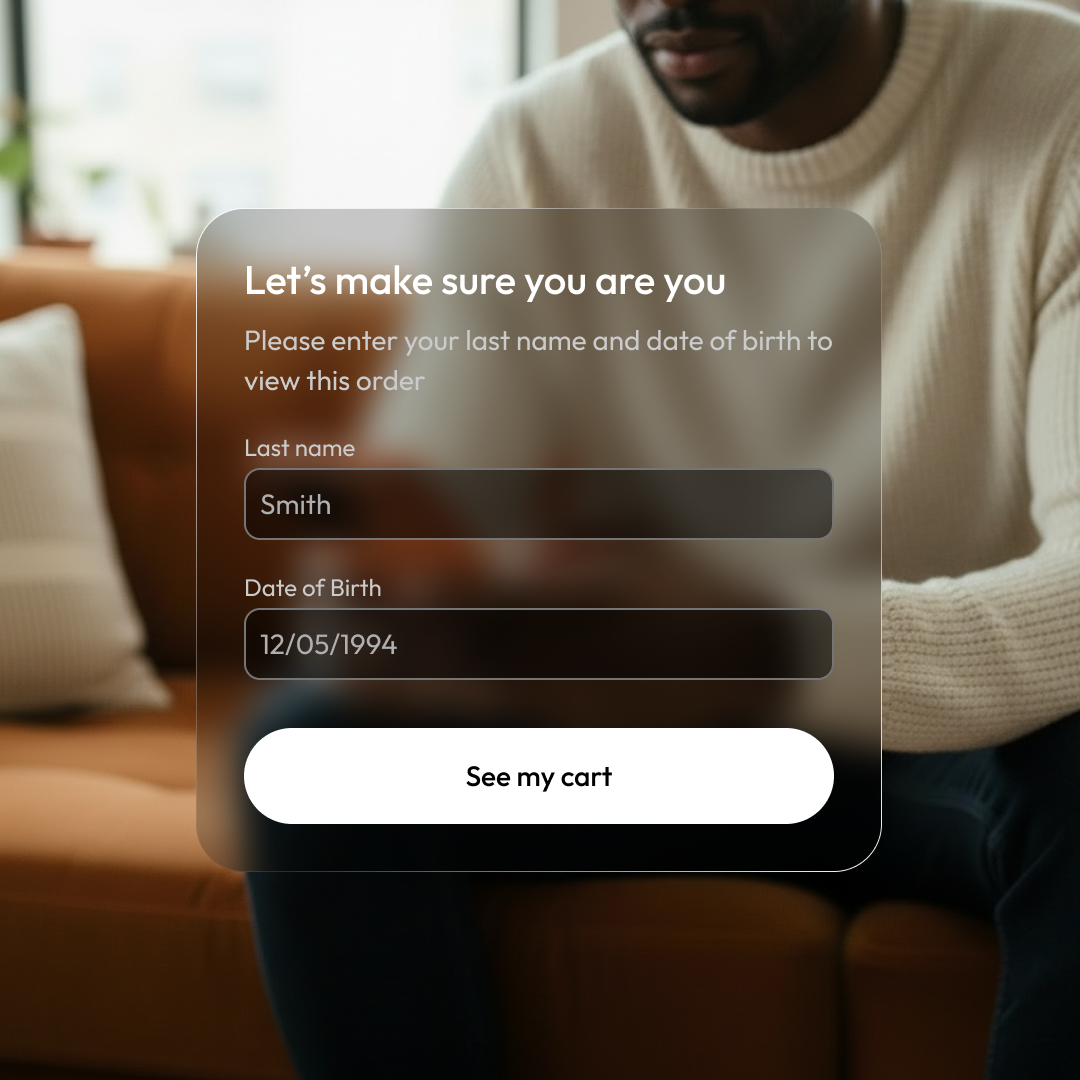 Patients verify their identity, review their prescription order, add OTC items, choose pickup or delivery, and pay in a single flow.