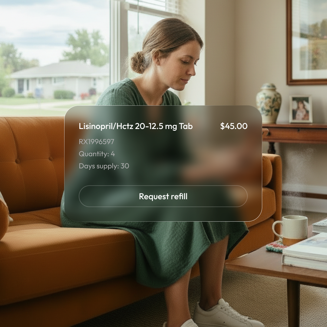 Patients can request prescription refills directly from their order history with a single tap. No phone calls, portals, or extra steps required.